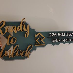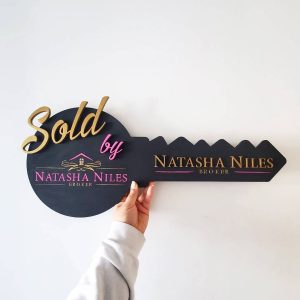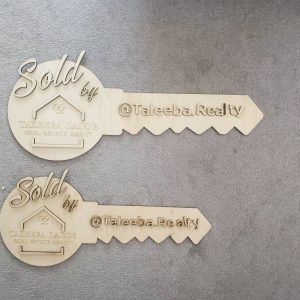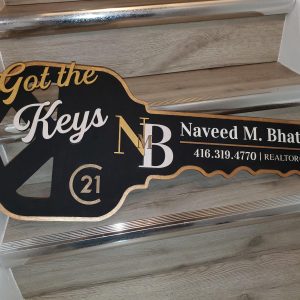 This decorative sign is crafted from quality wood and shaped like a key, designed for use as a photo prop or office accessory.